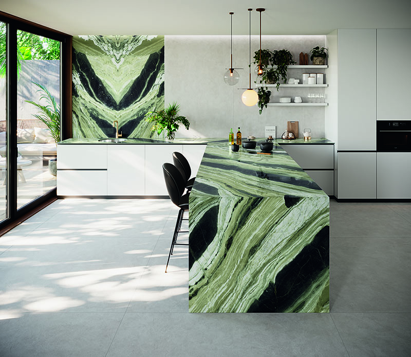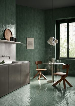 - Jade Terrain: Inspired by the precious stone, this trend captures the serenity, sophistication and luxury of jade green as it translates into ceramic and porcelain tile. Jade green, positioned near the center of the green color family, showcases a wide array of hues in jade-inspired tiles, ranging from soft pastel greens and vibrant turquoises to deep, earth-toned mossy shades and saturated tones with subtle shadows of black. With product selections such as monochromatic subway tiles, two-toned mosaics, large-format tiles with shades of jade veining and much more, this trend offers designers and installers remarkable versatility and lends itself equally to calming interiors and bold architectural statements.