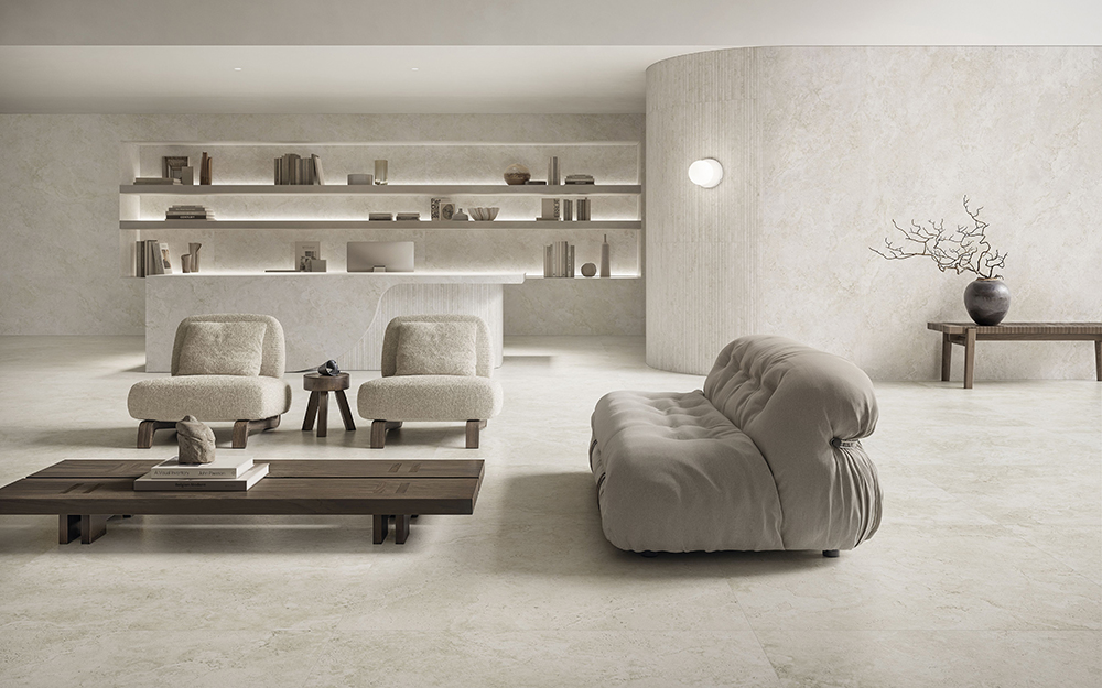 - Organic Minimalism: Evolving to a cooler, more minimal aesthetic, this season manufacturers are emphasizing tranquility, texture and lasting stone effects. This trend represents a collective return to structured, quiet spaces, desaturated tones and the integrity of durable materials. This approach elevates raw elemental surfaces, such as concrete and ivory stone looks, into refined, tactile expressions of calm, sophisticated design.