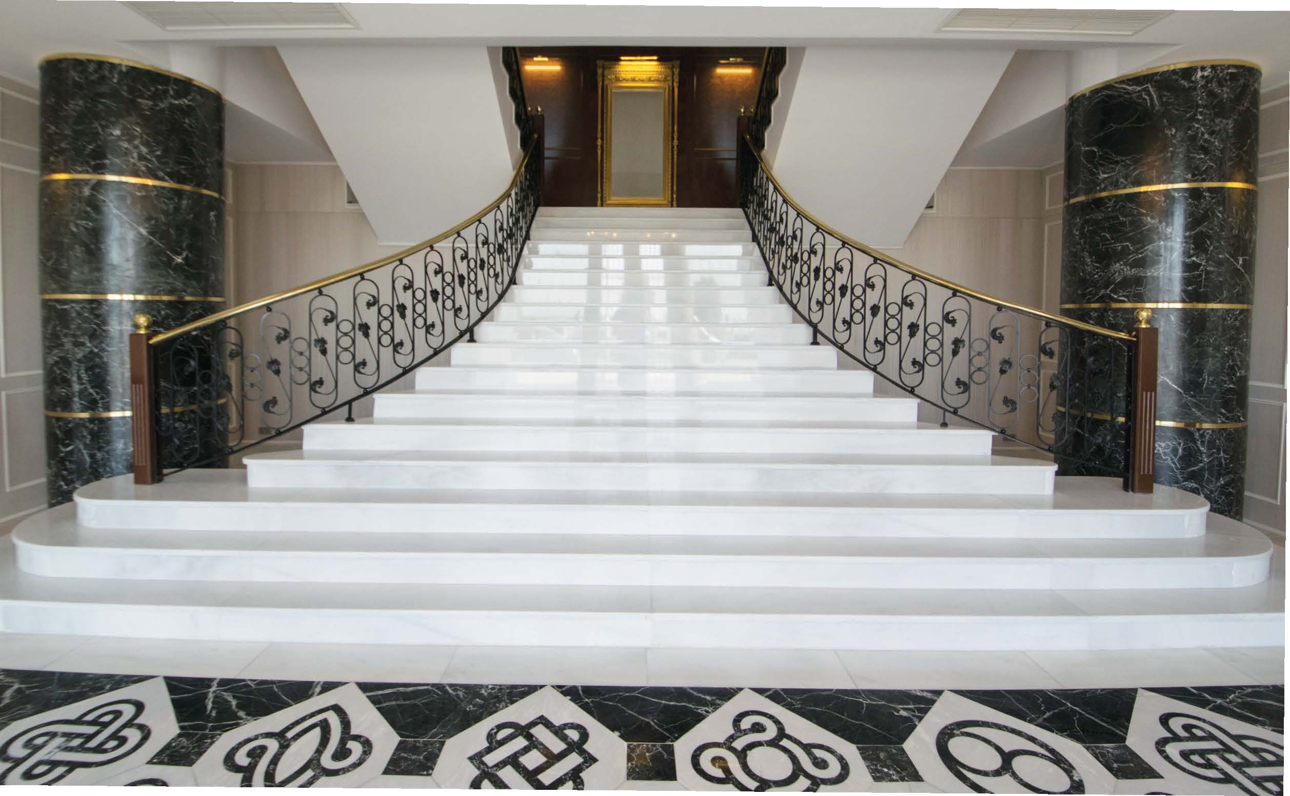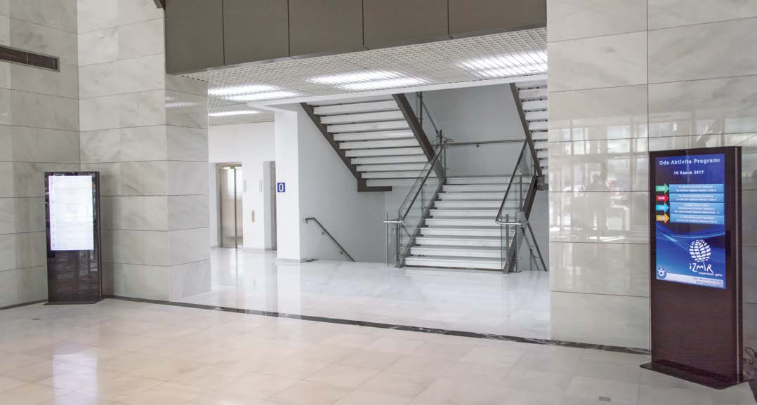 Kemalpaşa White plays the leading role on all exterior, floor and stair coverings of the building of İzmir Chamber of Commerce, whose project was designed by Ayyapı Mimarlık and constructed by KSC İnşaat. In every part of the new building, the white marble produced in Kemalpaşa region of Bursa, catches the eye. Approximately 5 thousand square meters of Kemalpaşa White was used in the building which covers 12 thousand square meters in total. In the entrance hall of the building, an elegant appearance has been achieved thanks to the composition of six motives on the mosaics found in Agora excavation which were crafted on the white marble used in floor laying.