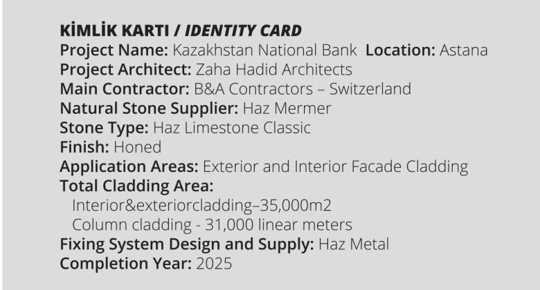 One of the projects that brings pride to the Turkish natural stone sector… The National Bank of Kazakhstan… This magnificent project, adorned with limestone bearing Haz Mermer’s signature, captivates with both its elegance and its details. The Kazakhstan National Bank Project, located in Astana, has been realized as one of the iconic project of contemporary architecture in the region. The architectural design, created by Zaha Hadid Architects, known worldwide as the “queen of curves” and 2004 Pritzker Prize winners, stands out with its its fluid geometry and powerful spatial composition.