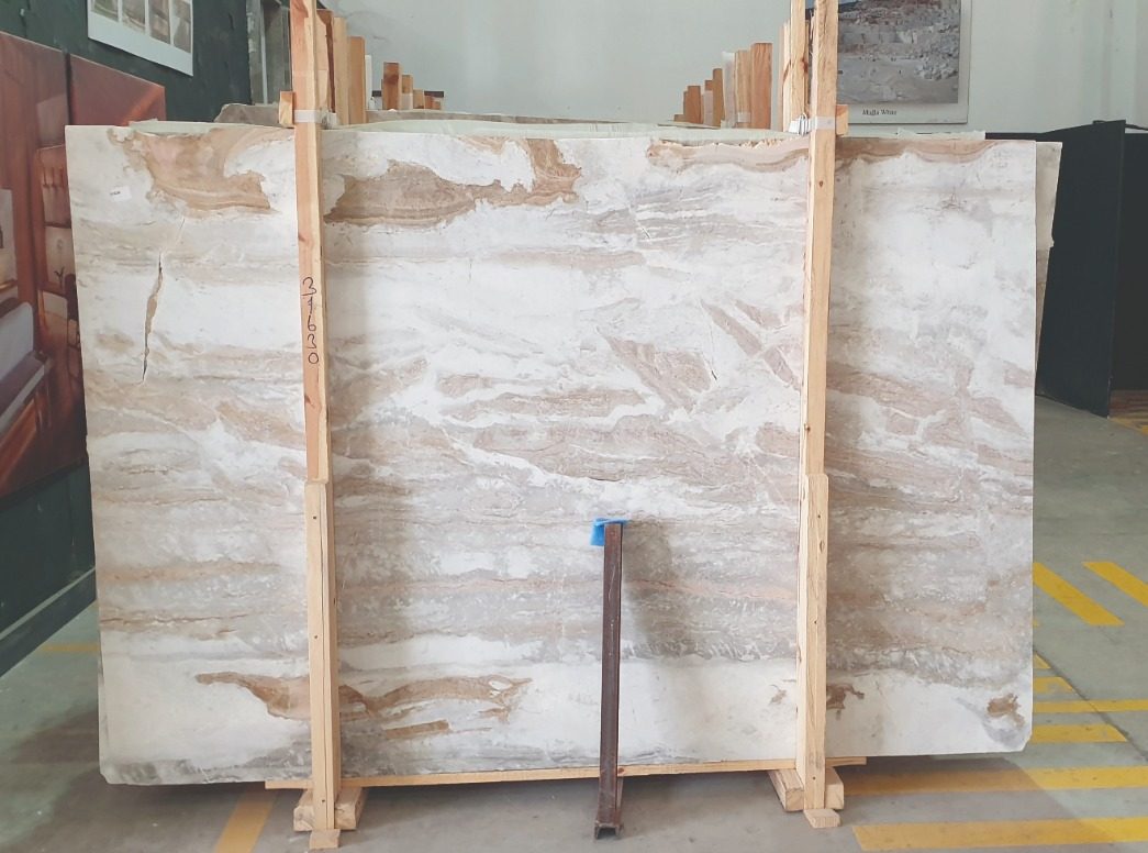 2022 Bursa Blok Fuarı’nda tanıştık bu ikiliyle… Üretimine henüz birkaç gün önce başlanmış, ilk çıkan bloklar apar topar Bursa’ya getirilmişti. Ermaş Mermer’in imzasını taşıyan Spica ve Tyana, firmanın Yatağan Ocağı’ndan çıkarılıyordu. Spica daha hareketli bir yapıya sahipti. Gri ve kahverengi tonlar, üzerinde uzanan mavi desenler ile adeta “Bookmatch kullanımı için hazırım” mesajı veriyordu. Tyana ise daha sade, ağır ve şık bir güzelliğe sahipti.